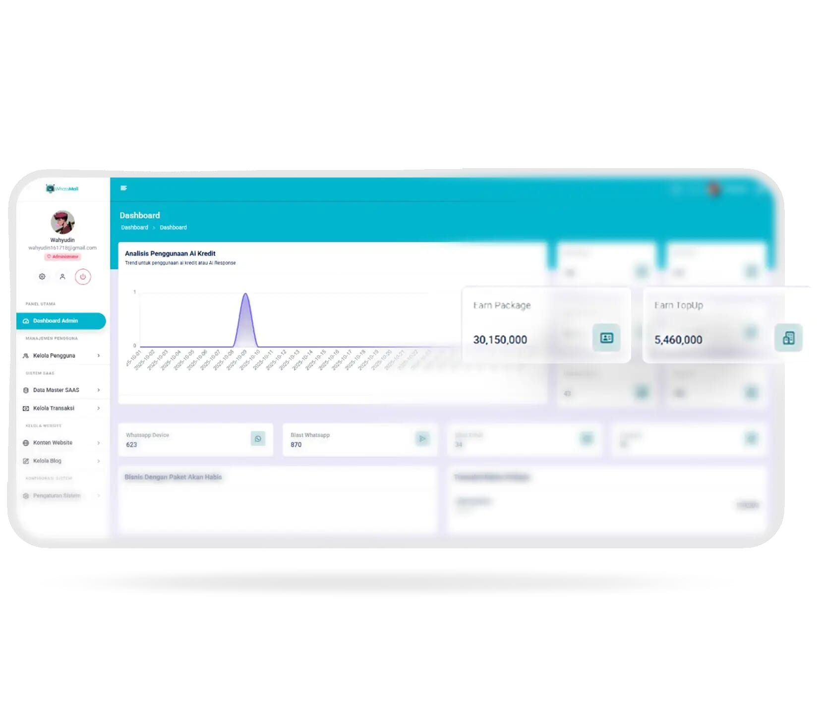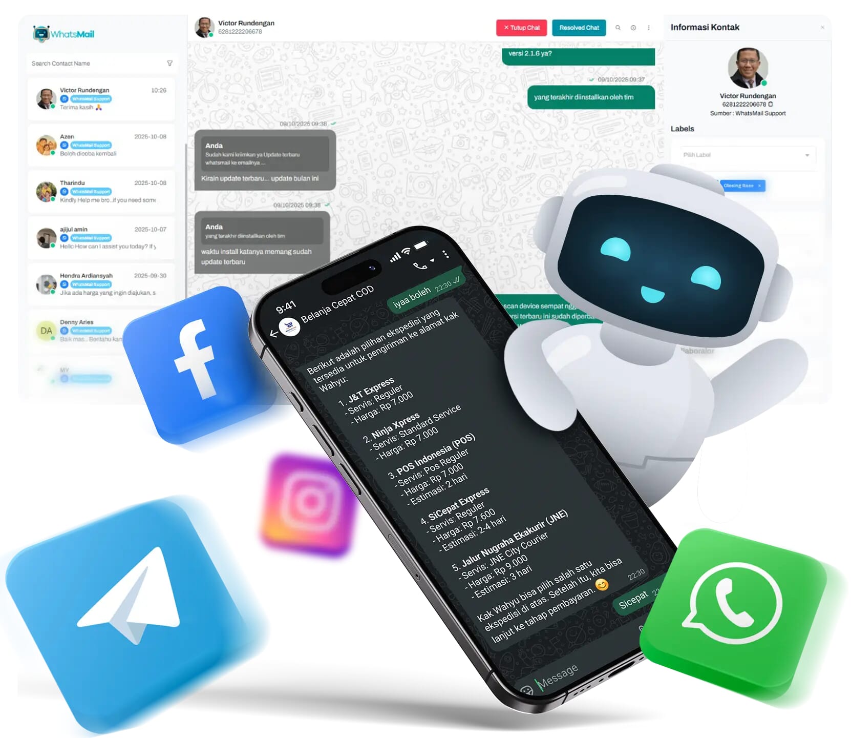 Bangun sistem chatbot AI dengan branding bisnismu sendiri tanpa perlu coding atau bikin dari nol. Semua bisa dijalankan dari satu dashboard Whatsmail